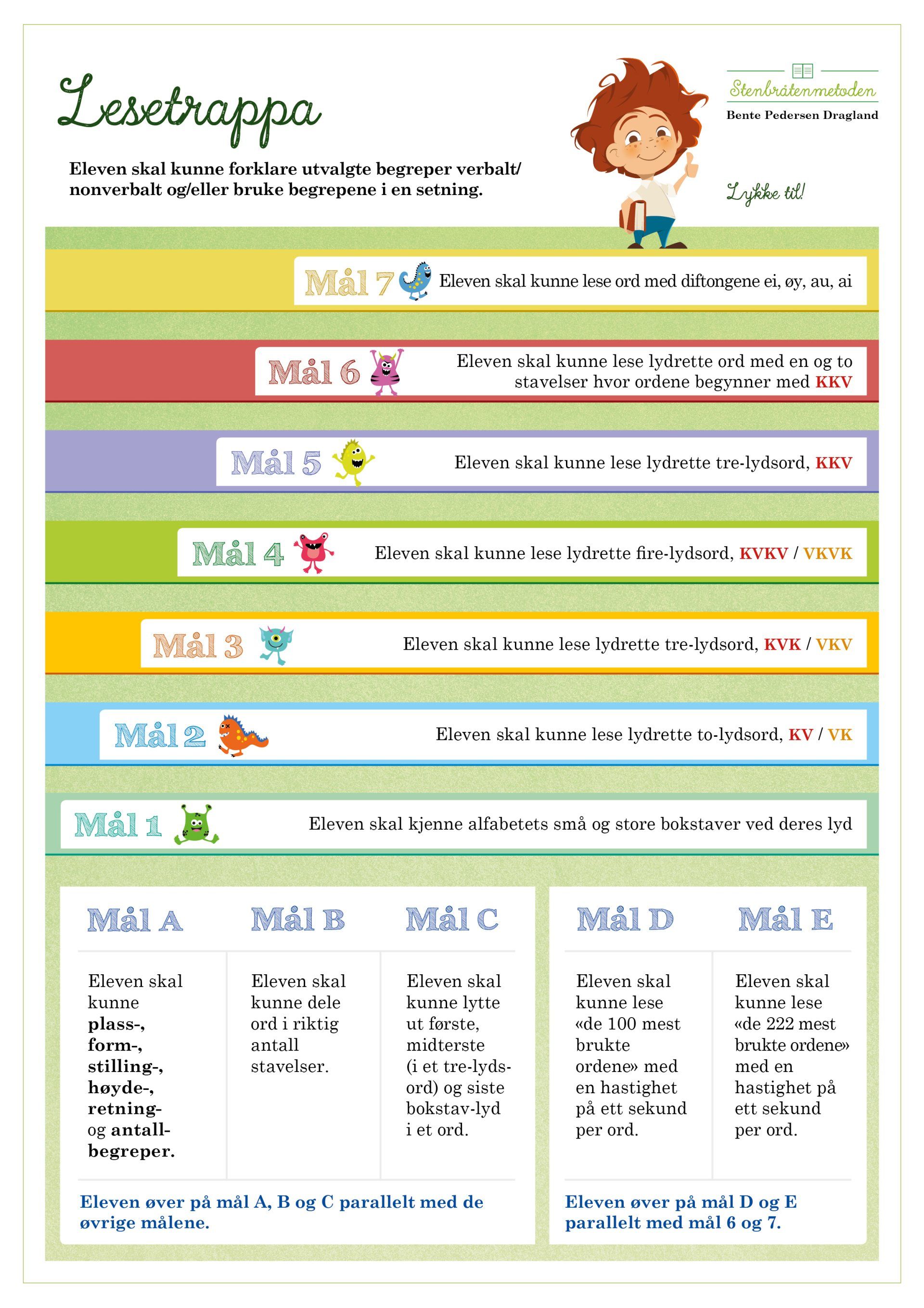 Stenbråtenmetoden dekker leseutviklingen fra en føralfabetisk fase til en automatisert alfabetisk fase. Når elevene behersker ferdighetsmålene i Lesetrappa, vil de ha utviklet automatiserte avkodingsferdigheter, ha funksjonell leseflyt og vil kunne lese tekster med god leseforståelse.
